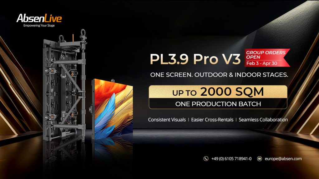Absen, the global leader in LED display technology and solutions, announces a European group order promotion for the PL3.9 Pro V3 LED display, from February 3 through April 30. The program allows rental and staging companies to secure panels from a single production batch, with up to 2,000 square meters available in one coordinated order.