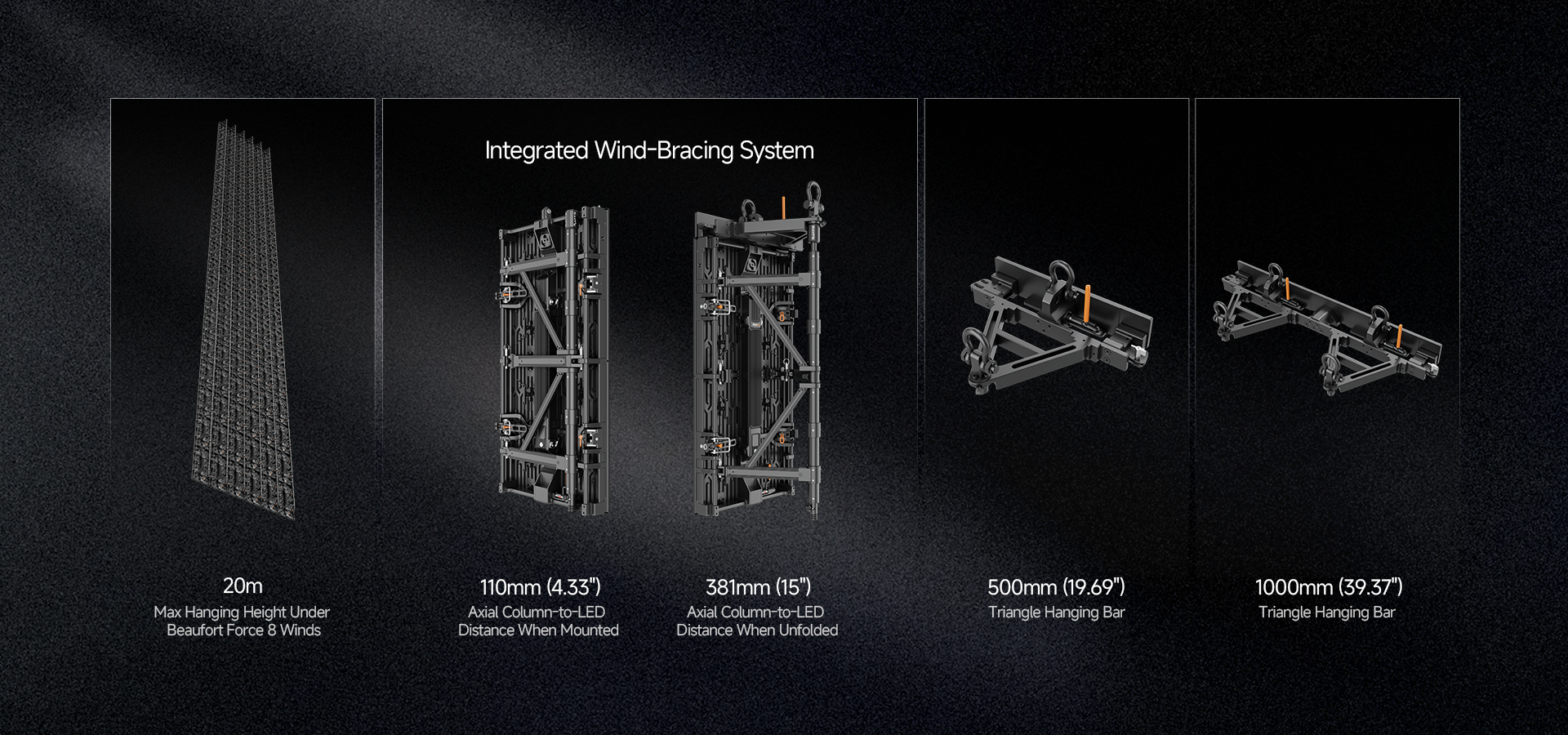 The PL3.9 Pro V3 can utilize an optional integrated wind-bracing system with a triple-stable design. When combined with reinforced triangle hanging bars, it supports secure installations up to 20 meters high and withstands Beaufort Force 8 winds (62-74 km/h, 184.9-267.8 Pa).